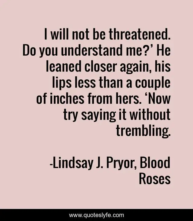 This page presents the quote "I will not be threatened. Do you understand me?’ He leaned closer again, his lips less than a couple of inches from hers. ‘Now try saying it without trembling.". Author of this quote is Lindsay J. Pryor, Blood Roses. This quote is about blackthorn, pnr, urban-fantasy, paranormal, paranormal-romance,.