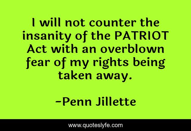 This page presents the quote "I will not counter the insanity of the PATRIOT Act with an overblown fear of my rights being taken away.". Author of this quote is Penn Jillette. This quote is about patriot, insanity, rights,.