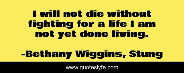 This page presents the quote "I will not die without fighting for a life I am not yet done living.". Author of this quote is Bethany Wiggins, Stung. This quote is about living, fighting,.