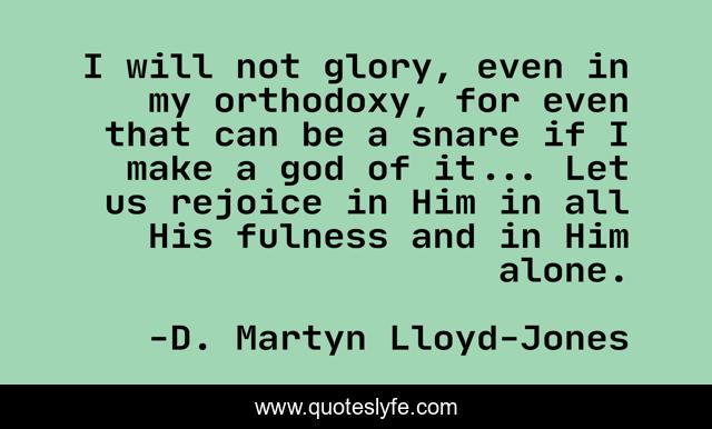 This page presents the quote "I will not glory, even in my orthodoxy, for even that can be a snare if I make a god of it... Let us rejoice in Him in all His fulness and in Him alone.". Author of this quote is D. Martyn Lloyd-Jones. This quote is about rejoice, orthodoxy, jesus,.