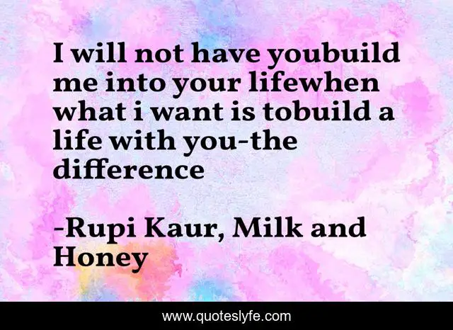 This page presents the quote "I will not have youbuild me into your lifewhen what i want is tobuild a life with you-the difference". Author of this quote is Rupi Kaur, Milk and Honey. This quote is about future, life-lessons,.