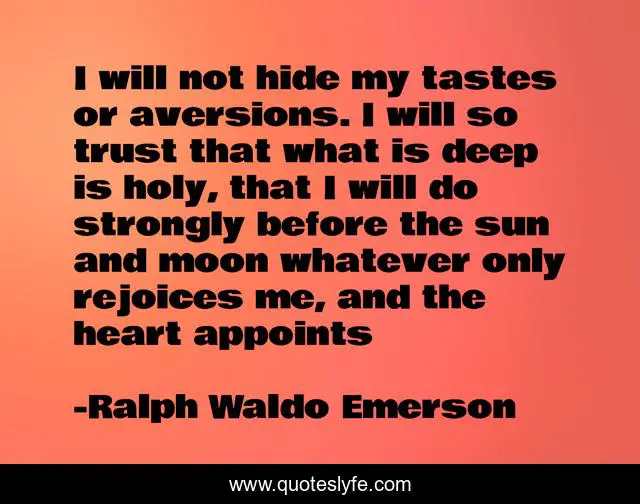 This page presents the quote "I will not hide my tastes or aversions. I will so trust that what is deep is holy, that I will do strongly before the sun and moon whatever only rejoices me, and the heart appoints". Author of this quote is Ralph Waldo Emerson. This quote is about be-yourself, oath, ataraxy, self-assuredness,.