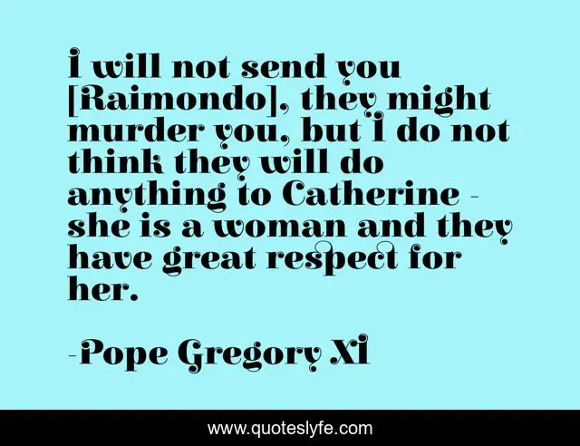 This page presents the quote "I will not send you [Raimondo], they might murder you, but I do not think they will do anything to Catherine - she is a woman and they have great respect for her.". Author of this quote is Pope Gregory XI. .