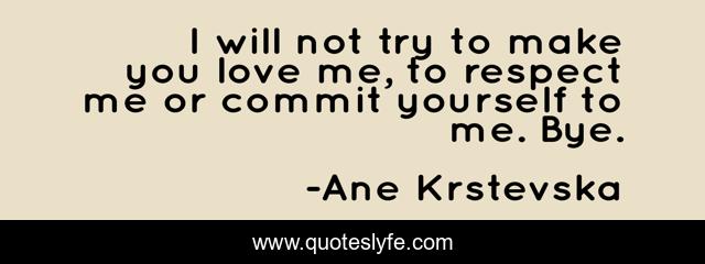 This page presents the quote "I will not try to make you love me, to respect me or commit yourself to me. Bye.". Author of this quote is Ane Krstevska. This quote is about confidence, positive, motivational, optimistic, inspirational, enthusiasm,.