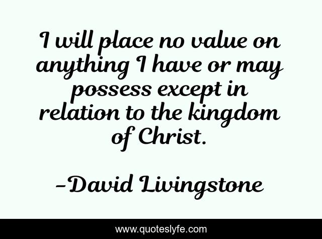 This page presents the quote "I will place no value on anything I have or may possess except in relation to the kingdom of Christ.". Author of this quote is David Livingstone. This quote is about kingdom, christ, value,.