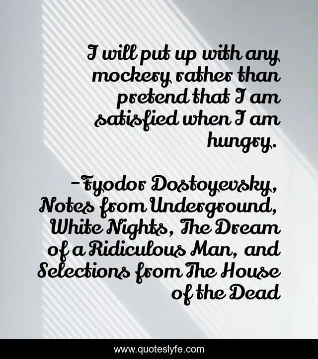 This page presents the quote "I will put up with any mockery rather than pretend that I am satisfied when I am hungry.". Author of this quote is Fyodor Dostoyevsky, Notes from Underground, White Nights, The Dream of a Ridiculous Man, and Selections from The House of the Dead. .