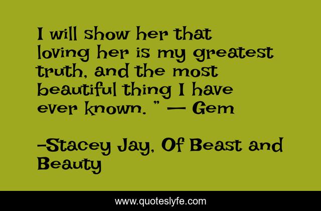 This page presents the quote "I will show her that loving her is my greatest truth, and the most beautiful thing I have ever known. ” — Gem". Author of this quote is Stacey Jay, Of Beast and Beauty. .