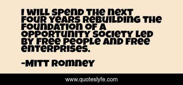 This page presents the quote "I will spend the next four years rebuilding the foundation of a opportunity society led by free people and free enterprises.". Author of this quote is Mitt Romney. This quote is about opportunity, free, people,.