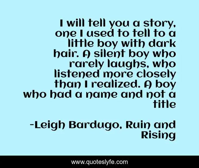This page presents the quote "I will tell you a story, one I used to tell to a little boy with dark hair. A silent boy who rarely laughs, who listened more closely than I realized. A boy who had a name and not a title". Author of this quote is Leigh Bardugo, Ruin and Rising. This quote is about leigh-bardugo, the-darkling, aleksander-morozova, sad, grisha, ruin-and-rising, baghra,.