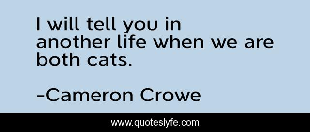 This page presents the quote "I will tell you in another life when we are both cats.". Author of this quote is Cameron Crowe. This quote is about romance, bittersweet, love, affection, movies,.