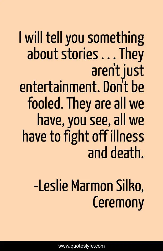 This page presents the quote "I will tell you something about stories . . . They aren't just entertainment. Don't be fooled. They are all we have, you see, all we have to fight off illness and death.". Author of this quote is Leslie Marmon Silko, Ceremony. .