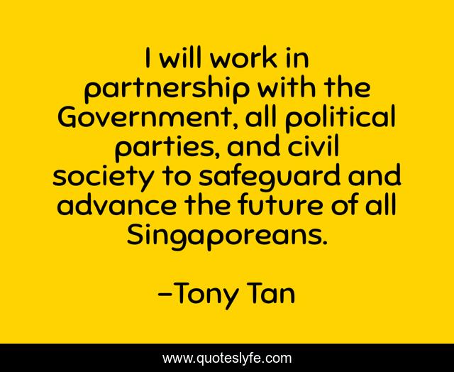This page presents the quote "I will work in partnership with the Government, all political parties, and civil society to safeguard and advance the future of all Singaporeans.". Author of this quote is Tony Tan. This quote is about work, society, future,.