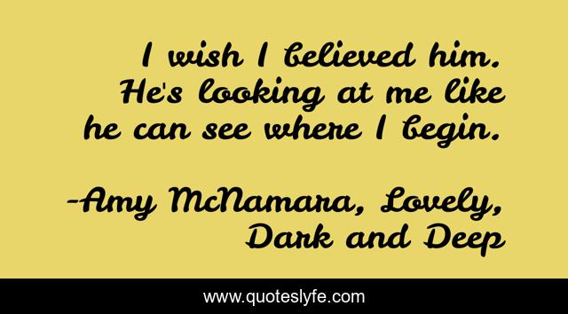 This page presents the quote "I wish I believed him. He's looking at me like he can see where I begin.". Author of this quote is Amy McNamara, Lovely, Dark and Deep. This quote is about beautiful, love, grief, heartbreak, inspirational, enthusiasm, affection,.