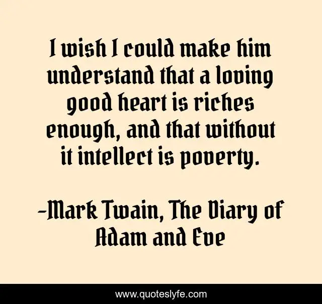 This page presents the quote "I wish I could make him understand that a loving good heart is riches enough, and that without it intellect is poverty.". Author of this quote is Mark Twain, The Diary of Adam and Eve. This quote is about adam-and-eve, enthusiasm, intellect, inspirational, morality,.