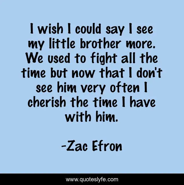 This page presents the quote "I wish I could say I see my little brother more. We used to fight all the time but now that I don't see him very often I cherish the time I have with him.". Author of this quote is Zac Efron. This quote is about wish, brother, fight,.