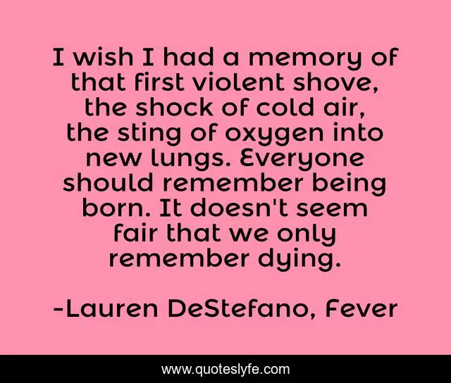 This page presents the quote "I wish I had a memory of that first violent shove, the shock of cold air, the sting of oxygen into new lungs. Everyone should remember being born. It doesn't seem fair that we only remember dying.". Author of this quote is Lauren DeStefano, Fever. This quote is about remembering, death, birth, dying,.