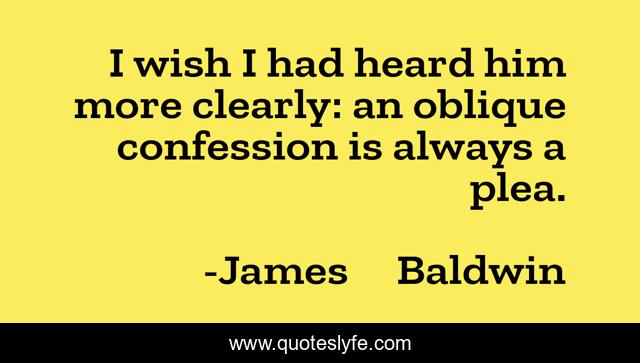 This page presents the quote "I wish I had heard him more clearly: an oblique confession is always a plea.". Author of this quote is James Baldwin. This quote is about longing, pride, love, regret, nostalgia, listening, confessions, affection,.