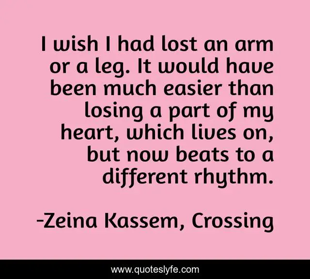 This page presents the quote "I wish I had lost an arm or a leg. It would have been much easier than losing a part of my heart, which lives on, but now beats to a different rhythm.". Author of this quote is Zeina Kassem, Crossing. This quote is about life, death, pain, middle-eastern, missing, lebanon, missing-someone, arab, motherhood,.