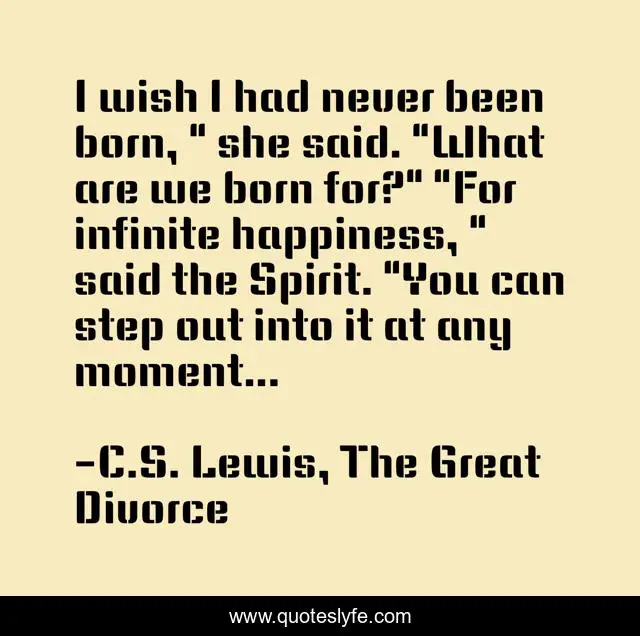 This page presents the quote "I wish I had never been born, " she said. "What are we born for?" "For infinite happiness, " said the Spirit. "You can step out into it at any moment...". Author of this quote is C.S. Lewis, The Great Divorce. This quote is about spirituality, life, happiness,.