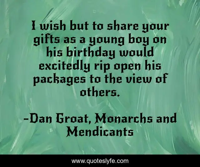 This page presents the quote "I wish but to share your gifts as a young boy on his birthday would excitedly rip open his packages to the view of others.". Author of this quote is Dan Groat, Monarchs and Mendicants. This quote is about boy, sharing, gift, package, share, gifts, birthday, young-boy, youth,.