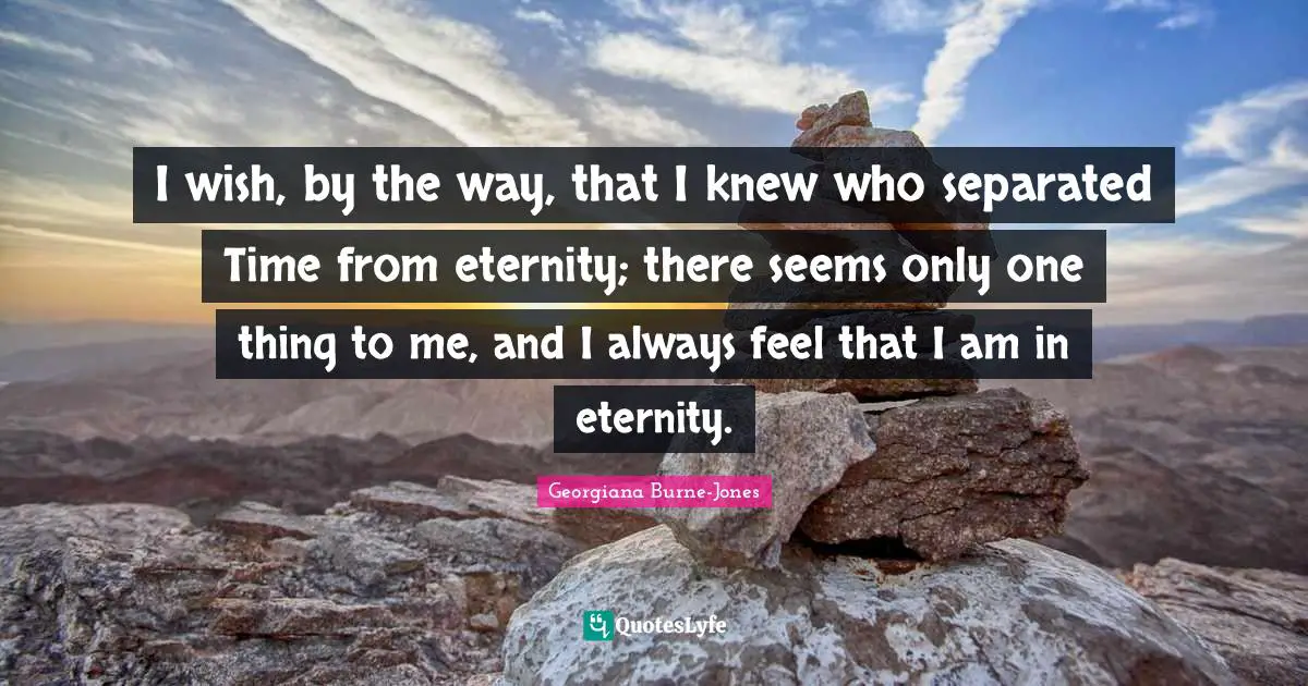 This page presents the quote "I wish, by the way, that I knew who separated Time from eternity; there seems only one thing to me, and I always feel that I am in eternity.". Author of this quote is Georgiana Burne-Jones. This quote is about time, way, seems, eternity, wish, one thing,.