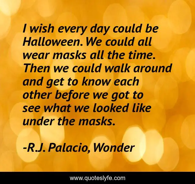 This page presents the quote "I wish every day could be Halloween. We could all wear masks all the time. Then we could walk around and get to know each other before we got to see what we looked like under the masks.". Author of this quote is R.J. Palacio, Wonder. This quote is about bullying, r-j-palacio, beauty, wonder,.