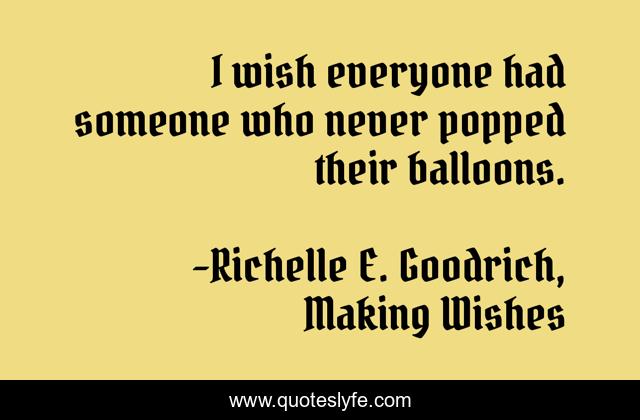 This page presents the quote "I wish everyone had someone who never popped their balloons.". Author of this quote is Richelle E. Goodrich, Making Wishes. This quote is about having-someone, friendship, friends, wishes, richelle, goodness, richelle-e-goodrich, hopes, richelle-goodrich,.