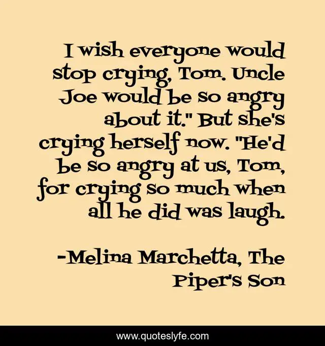 This page presents the quote "I wish everyone would stop crying, Tom. Uncle Joe would be so angry about it." But she's crying herself now. "He'd be so angry at us, Tom, for crying so much when all he did was laugh.". Author of this quote is Melina Marchetta, The Piper's Son. This quote is about grief, death,.