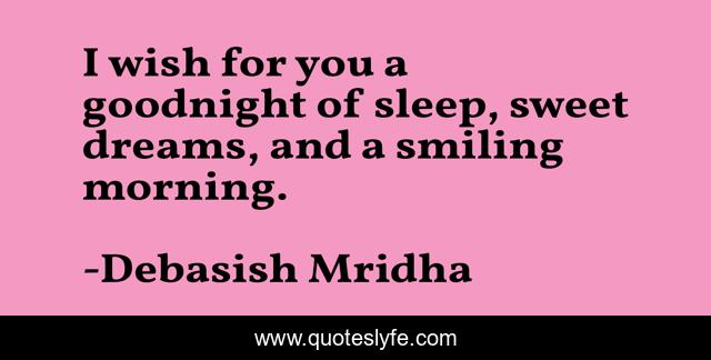 This page presents the quote "I wish for you a goodnight of sleep, sweet dreams, and a smiling morning.". Author of this quote is Debasish Mridha. This quote is about i-wish-for-you, philosophy, debasish-mridha, sweet-dreams, quotes, goodnight-sleep, debasish-mridha-md, inspirational, enthusiasm,.