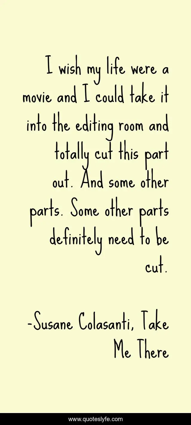 This page presents the quote "I wish my life were a movie and I could take it into the editing room and totally cut this part out. And some other parts. Some other parts definitely need to be cut.". Author of this quote is Susane Colasanti, Take Me There. This quote is about life, editing-a-tragic-experience, regret,.