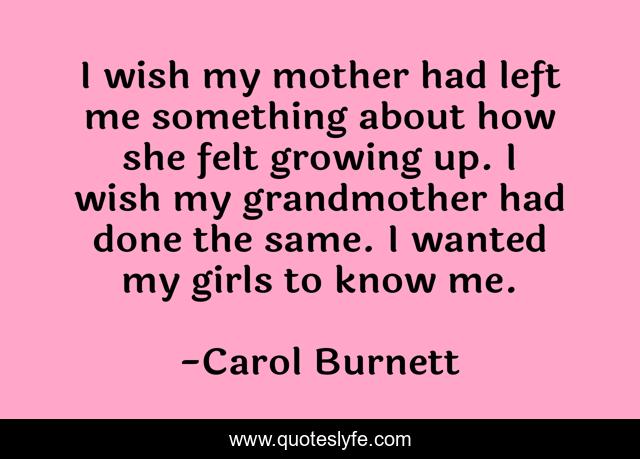This page presents the quote "I wish my mother had left me something about how she felt growing up. I wish my grandmother had done the same. I wanted my girls to know me.". Author of this quote is Carol Burnett. This quote is about me, growing up, mother,.