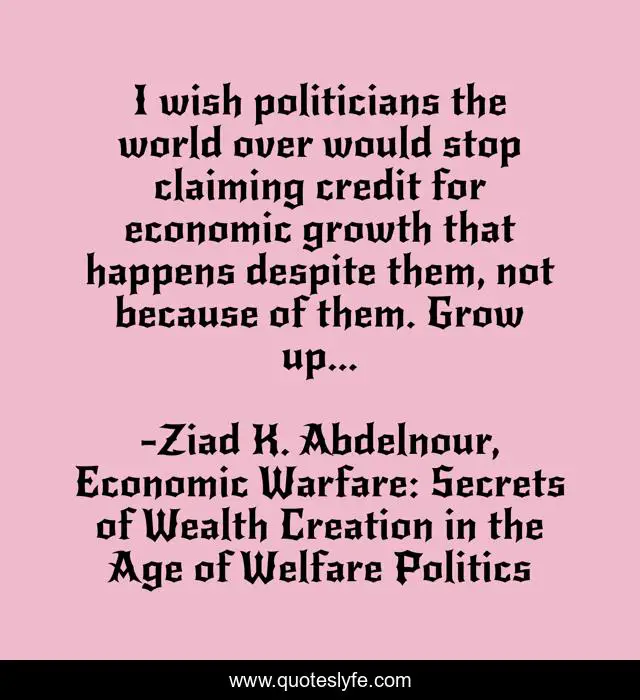 This page presents the quote "I wish politicians the world over would stop claiming credit for economic growth that happens despite them, not because of them. Grow up...". Author of this quote is Ziad K. Abdelnour, Economic Warfare: Secrets of Wealth Creation in the Age of Welfare Politics. This quote is about politicians, economic-growth,.