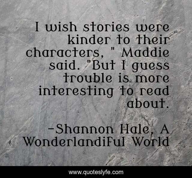 This page presents the quote "I wish stories were kinder to their characters, " Maddie said. "But I guess trouble is more interesting to read about.". Author of this quote is Shannon Hale, A Wonderlandiful World. This quote is about trouble, kindness, stories, characters,.