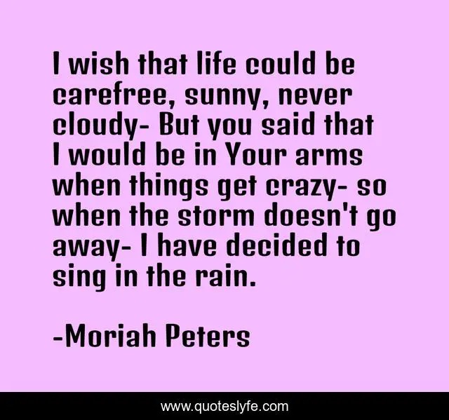 This page presents the quote "I wish that life could be carefree, sunny, never cloudy- But you said that I would be in Your arms when things get crazy- so when the storm doesn't go away- I have decided to sing in the rain.". Author of this quote is Moriah Peters. This quote is about singing, storms, singing-in-the-rain, rain,.