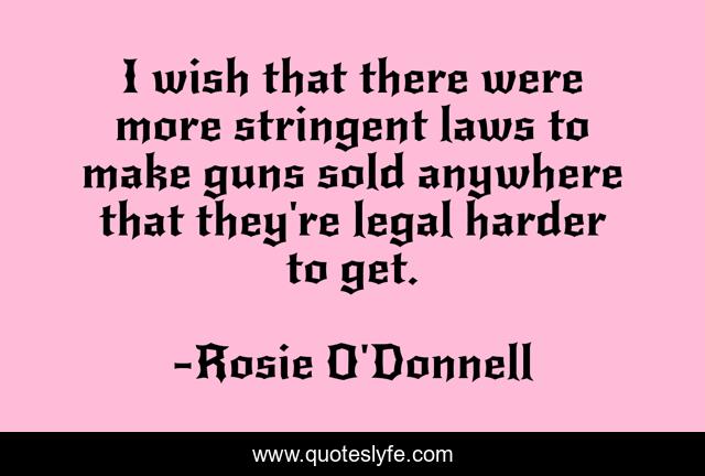 This page presents the quote "I wish that there were more stringent laws to make guns sold anywhere that they're legal harder to get.". Author of this quote is Rosie O'Donnell. This quote is about wish, guns, laws,.