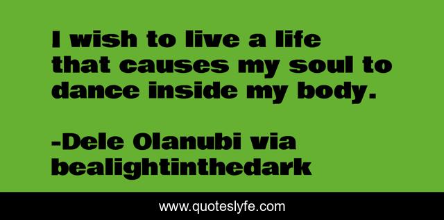 This page presents the quote "I wish to live a life that causes my soul to dance inside my body.". Author of this quote is Dele Olanubi via bealightinthedark. This quote is about dance, wish, life, soul,.