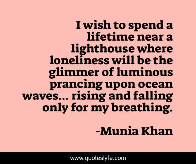 This page presents the quote "I wish to spend a lifetime near a lighthouse where loneliness will be the glimmer of luminous prancing upon ocean waves… rising and falling only for my breathing.". Author of this quote is Munia Khan. This quote is about lighthouses, oceanic, life, breathing, glimmer, wish, loneliness, lighthouse, spiritual,.