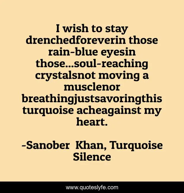 This page presents the quote "I wish to stay drenchedforeverin those rain-blue eyesin those...soul-reaching crystalsnot moving a musclenor breathingjustsavoringthis turquoise acheagainst my heart.". Author of this quote is Sanober Khan, Turquoise Silence. This quote is about heart, eyes, breathing, romantic, longing, savor, ache, indian-authors, poetry,.