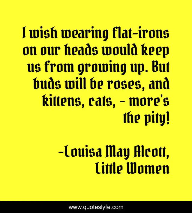 This page presents the quote "I wish wearing flat-irons on our heads would keep us from growing up. But buds will be roses, and kittens, cats, - more's the pity!". Author of this quote is Louisa May Alcott, Little Women. .