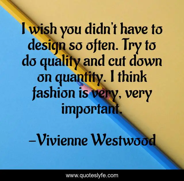This page presents the quote "I wish you didn't have to design so often. Try to do quality and cut down on quantity. I think fashion is very, very important.". Author of this quote is Vivienne Westwood. This quote is about fashion, quality, think,.