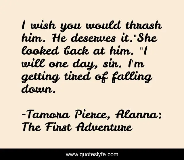 This page presents the quote "I wish you would thrash him. He deserves it."She looked back at him. "I will one day, sir. I'm getting tired of falling down.". Author of this quote is Tamora Pierce, Alanna: The First Adventure. This quote is about justice, determination, humor,.
