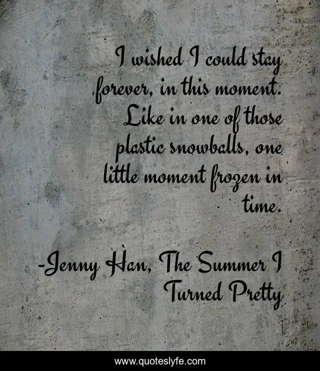 This page presents the quote "I wished I could stay forever, in this moment. Like in one of those plastic snowballs, one little moment frozen in time.". Author of this quote is Jenny Han, The Summer I Turned Pretty. .