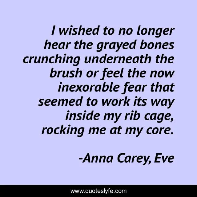 This page presents the quote "I wished to no longer hear the grayed bones crunching underneath the brush or feel the now inexorable fear that seemed to work its way inside my rib cage, rocking me at my core.". Author of this quote is Anna Carey, Eve. This quote is about ana-carey, eve, lost,.