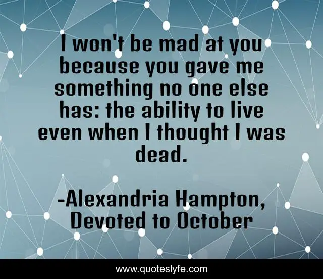 This page presents the quote "I won't be mad at you because you gave me something no one else has: the ability to live even when I thought I was dead.". Author of this quote is Alexandria Hampton, Devoted to October. This quote is about love, recovery, positivity, positive-thinking, heartbreak, love-hurts, positive-thoughts, affection,.