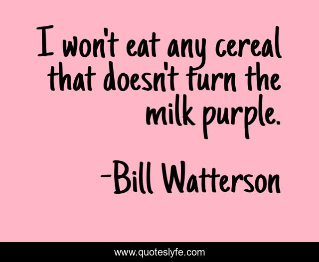 This page presents the quote "I won't eat any cereal that doesn't turn the milk purple.". Author of this quote is Bill Watterson. This quote is about purple, turn, milk,.