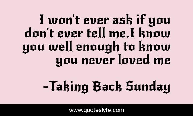 This page presents the quote "I won't ever ask if you don't ever tell me.I know you well enough to know you never loved me". Author of this quote is Taking Back Sunday. .