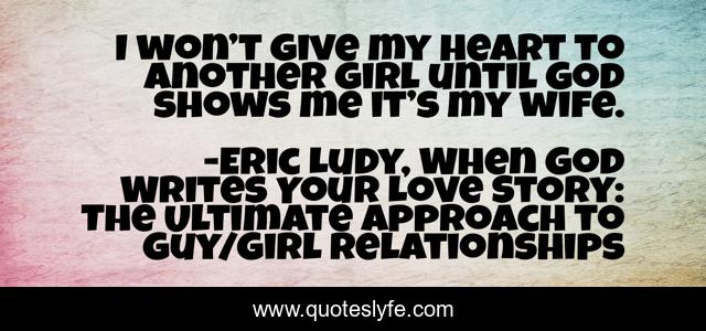 This page presents the quote "I won’t give my heart to another girl until God shows me it’s my wife.". Author of this quote is Eric Ludy, When God Writes Your Love Story: The Ultimate Approach to Guy/Girl Relationships. This quote is about courtship, engagement, marriage, dating, christian-dating,.