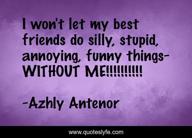 This page presents the quote "I won't let my best friends do silly, stupid, annoying, funny things-WITHOUT ME!!!!!!!!!!". Author of this quote is Azhly Antenor. This quote is about bestfriends, friendship, togetherness,.