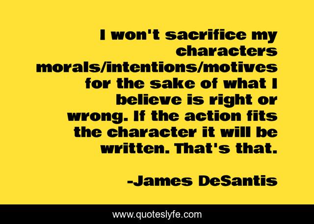 This page presents the quote "I won't sacrifice my characters morals/intentions/motives for the sake of what I believe is right or wrong. If the action fits the character it will be written. That's that.". Author of this quote is James DeSantis. This quote is about characters, morals, sacrifice, actions, writing, motives,.