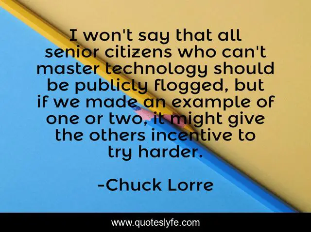 This page presents the quote "I won't say that all senior citizens who can't master technology should be publicly flogged, but if we made an example of one or two, it might give the others incentive to try harder.". Author of this quote is Chuck Lorre. This quote is about television, humor, sheldon-cooper, the-big-bang-theory, elderly, technology,.